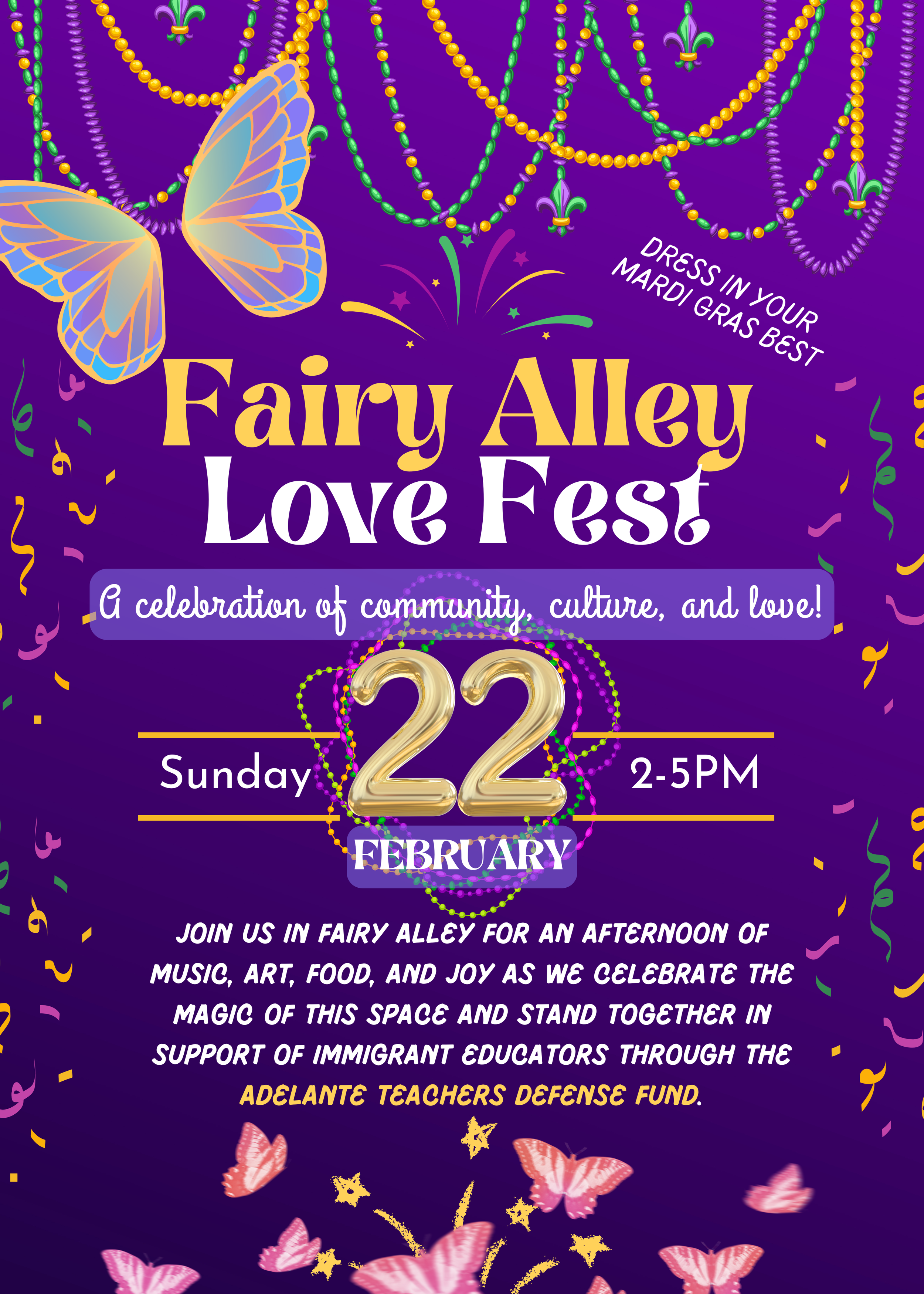 Join us in Fairy Alley for an afternoon of art, music, and food in celebration of the cultures and people who make Austin what it is. All proceeds will benefit the Adelante Teachers Defense Fund, which provides legal and emergency support to immigrant educators and families.